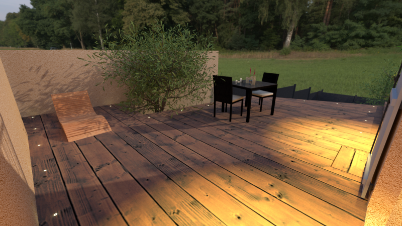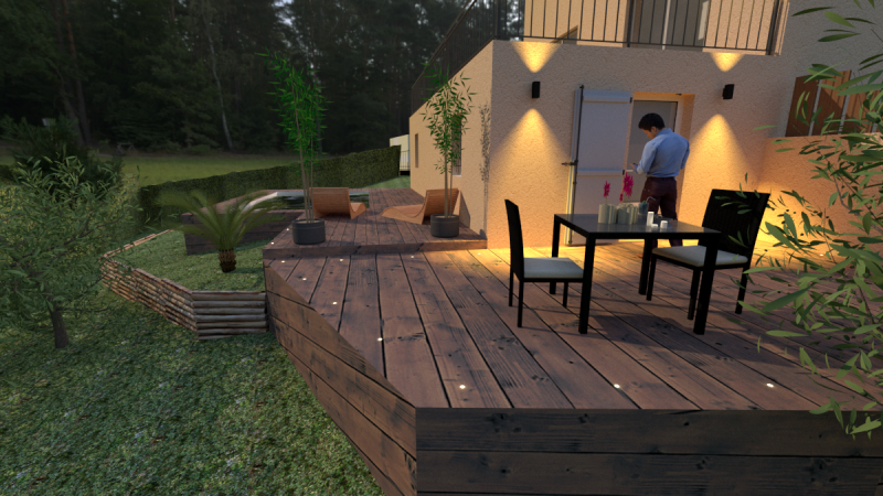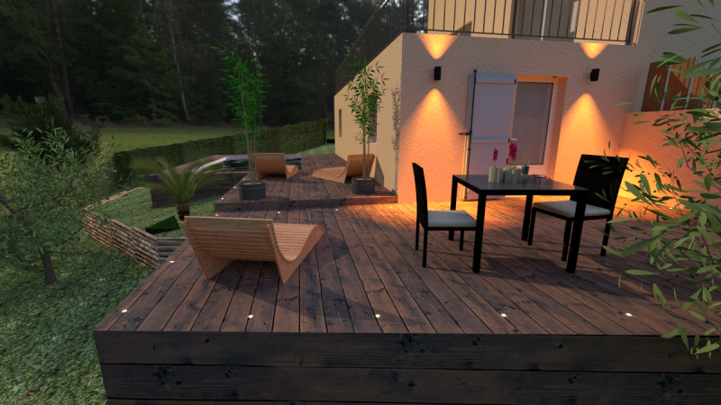 L’éclairage extérieur a été pensé comme un élément de mise en valeur et de confort. Des spots LED encastrés dans le platelage, associés à des appliques design et lampes solaires d’ambiance, offrent un éclairage doux et fonctionnel. De nuit, la terrasse se transforme en un véritable espace de vie à ciel ouvert, idéal pour prolonger les soirées d’été.