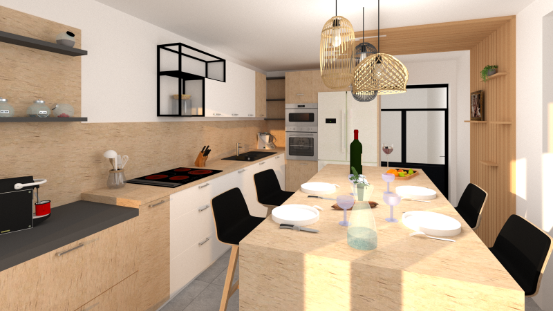 Cet aménagement intelligent transforme la cuisine en un lieu convivial et efficace, parfaitement adapté aux usages modernes.