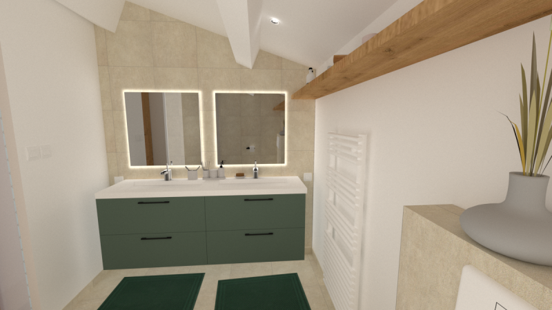 Cette réorganisation a été pensée pour fluidifier la circulation, optimiser chaque recoin et créer une salle d’eau à la fois aérée, fonctionnelle et élégante, malgré l’absence de fenêtre.