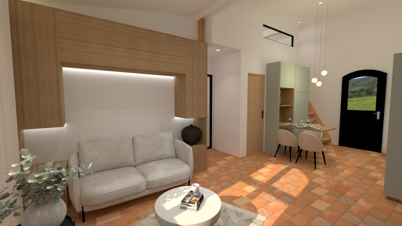 Une cloison sur-mesure, discrètement intégrée au mur, permet de délimiter l’espace entre le salon, la cuisine et la salle d’eau attenante. Cette séparation réversible offre un véritable confort d’usage et crée une intimité immédiate lorsque la pièce devient chambre d’appoint.