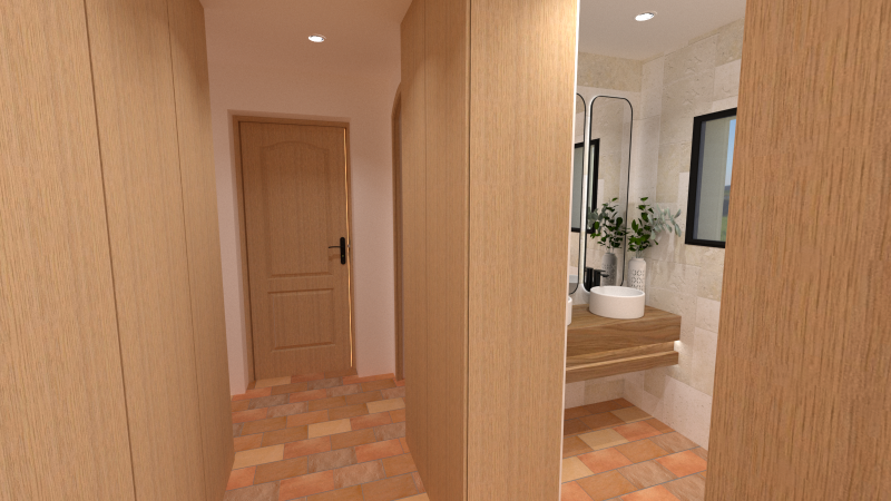 La chambre parentale et la salle d’eau ont été agencées de manière astucieuse pour maximiser l’espace disponible. Une séparation sur-mesure délimite subtilement la salle d’eau du dressing, offrant intimité et fluidité.